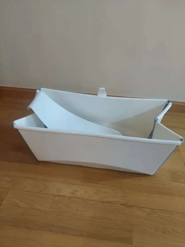 Bañera plegable para bebés, de color blanco. Es práctica y fácil de guardar. - Diseño compacto. - Material resistente.