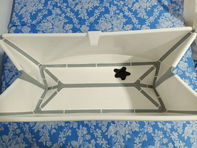 Bañera plegable de la marca Stokke, diseñada para facilitar el baño del bebé. - Diseño blanco con detalles en gris. - Plegable para un fácil almacenamiento.
