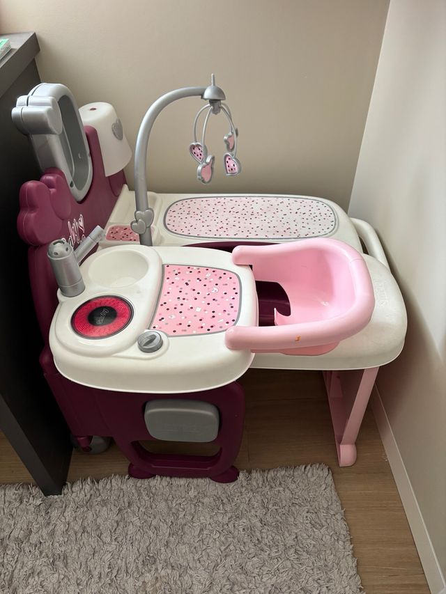 Set de juego para muñecas que incluye bañera y cambiador. - Diseño en color rosa y morado. - Incluye accesorios como móvil para cuna y grifo.