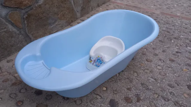 Conjunto de bañera y orinal para bebé. - Bañera de plástico azul. - Orinal blanco con diseño de elefante.