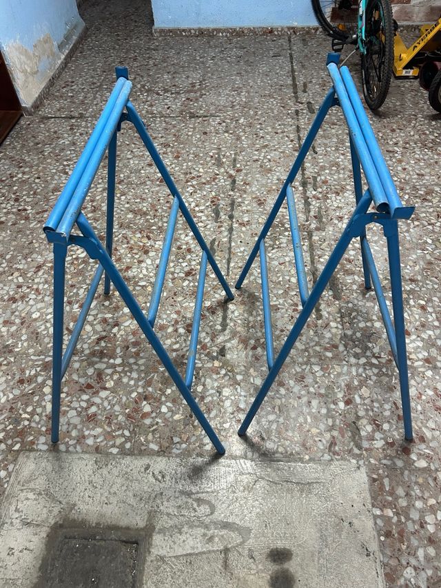 Par de banquetas metálicas de color azul. - Estructura tubular. - Diseño plegable.