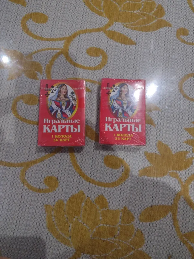 Dos barajas de cartas rusas, cada una con 36 cartas. Vienen precintadas en su plástico original.