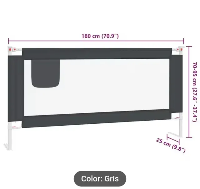 Detalles del productoBarandilla de seguridad para cama infantil en color gris oscuro. Mide 180 cm de largo y se ajusta a colchones de entre 70-95 cm de altura.