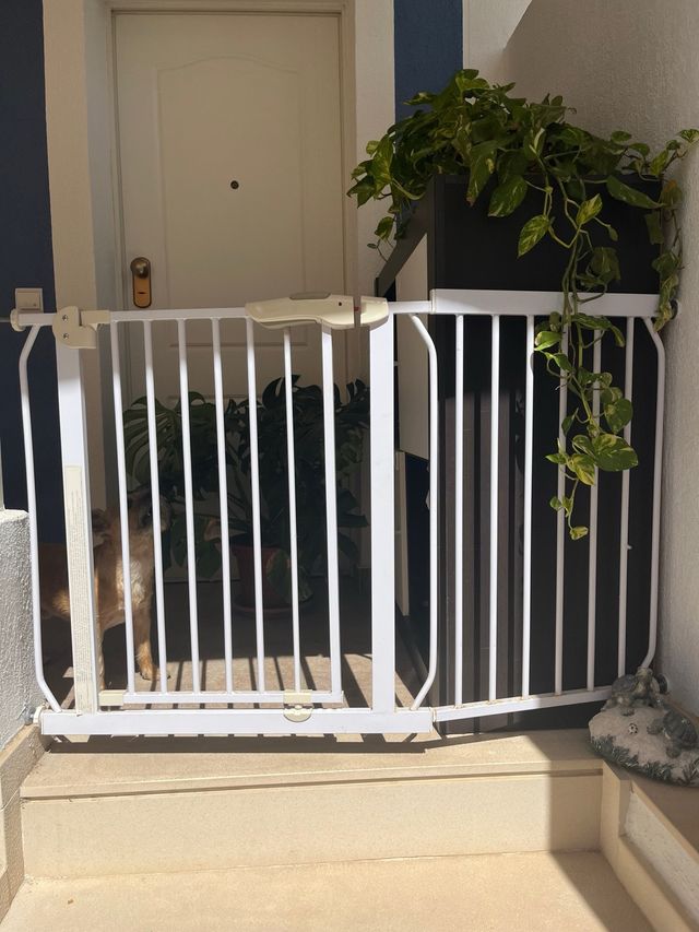 Barandilla de seguridad para escaleras o pasillos. Ideal para mantener a los niños y mascotas a salvo. - Ancho de 1,30 metros. - Estructura de metal blanco.