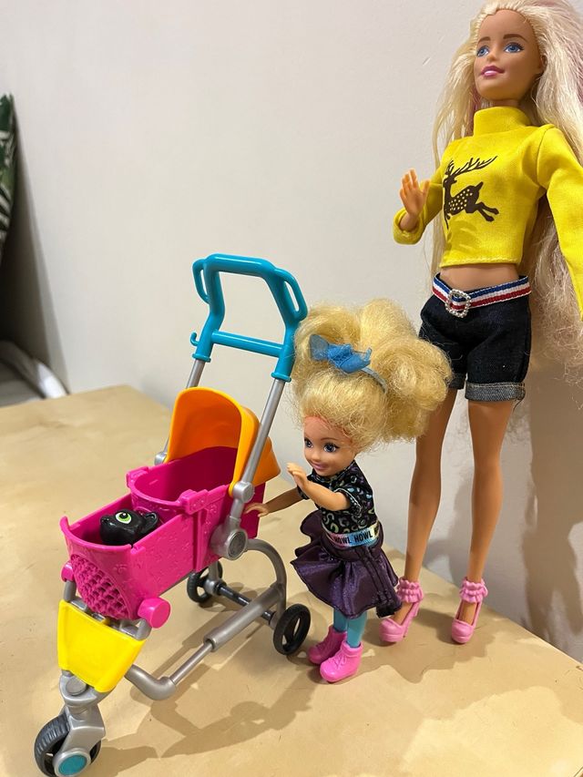 Detalles del productoSet de muñecas Barbie, una adulta y una bebé, con un carrito de paseo.
