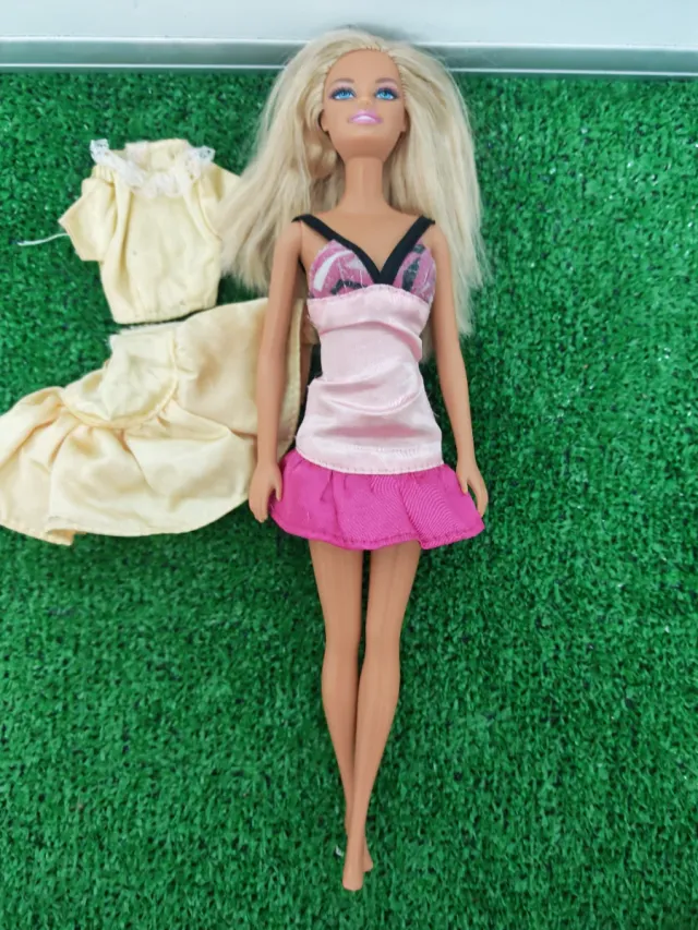 Muñeca Barbie con conjunto de ropa. - Vestido rosa con detalles. - Conjunto de dos piezas en color amarillo.