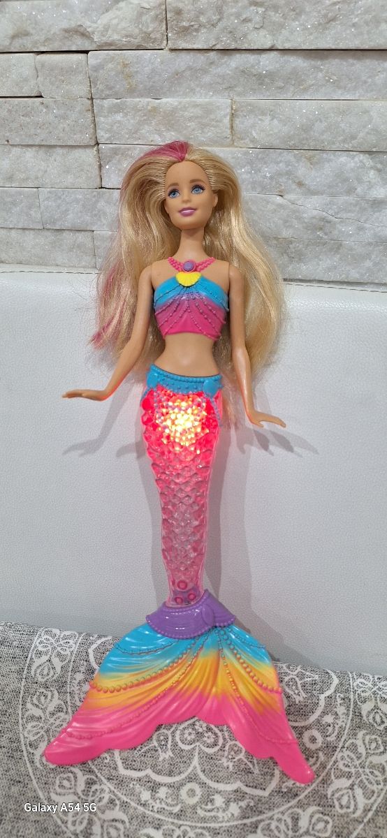 Detalles del productoPreciosa muñeca Barbie sirena con detalles brillantes. ¡Su cola brilla!