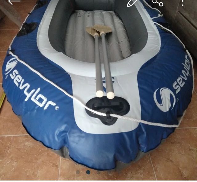 Detalles del productoBarca hinchable Sevylor en buen estado, ideal para actividades acuáticas. Incluye dos remos. Es azul y gris, con un diseño ligero y fácil de transportar.