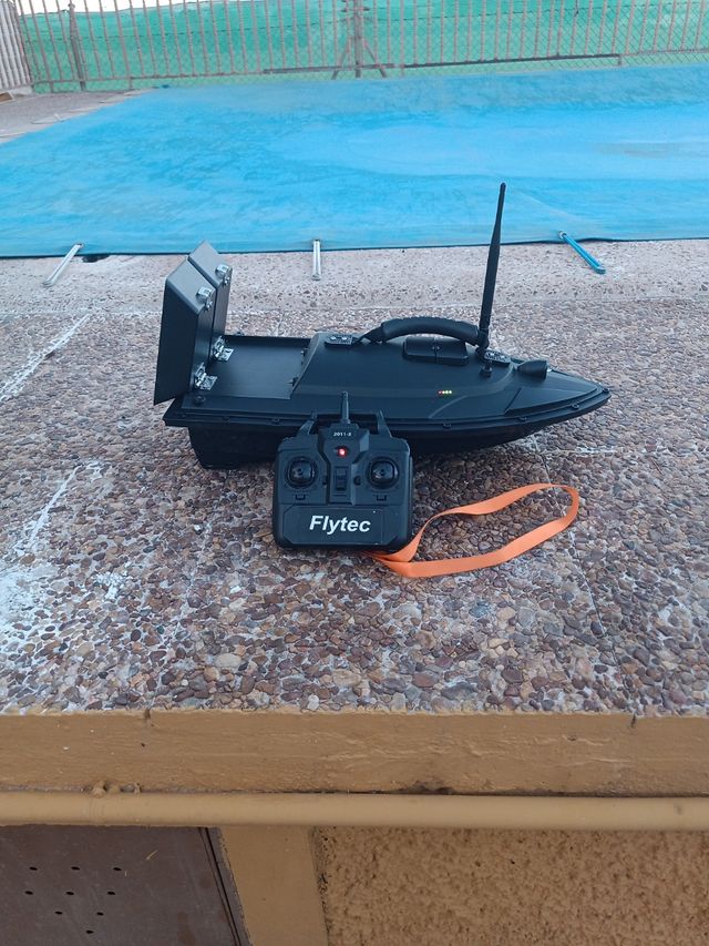 Barco cebador de pesca con mando a distancia. - Color negro. - Incluye mando Flytec. - Antena de transmisión.