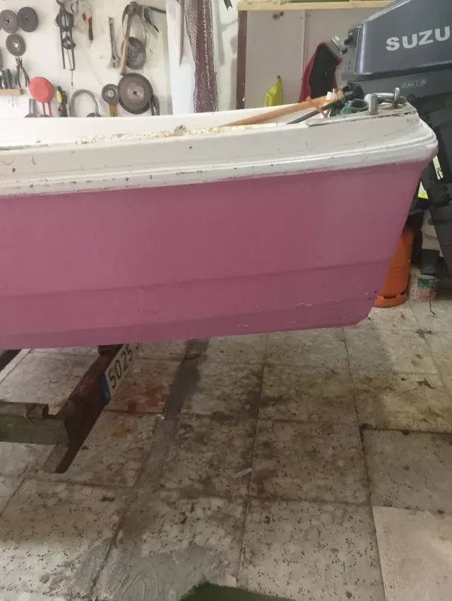 Barco de fibra marca Jovi, modelo 4. Ideal para paseos y pesca. - Casco de fibra de vidrio. - Color rosa y blanco.