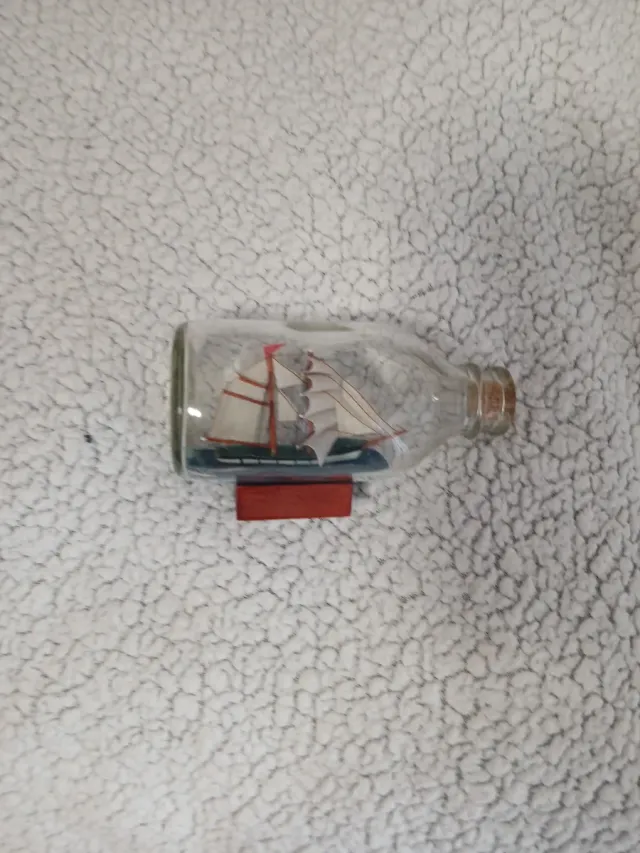 Miniatura de barco de vela dentro de una botella de cristal. Ideal como objeto decorativo. - Barco de vela con mástiles y velas blancas. - Base de madera roja. - Tapón de corcho.