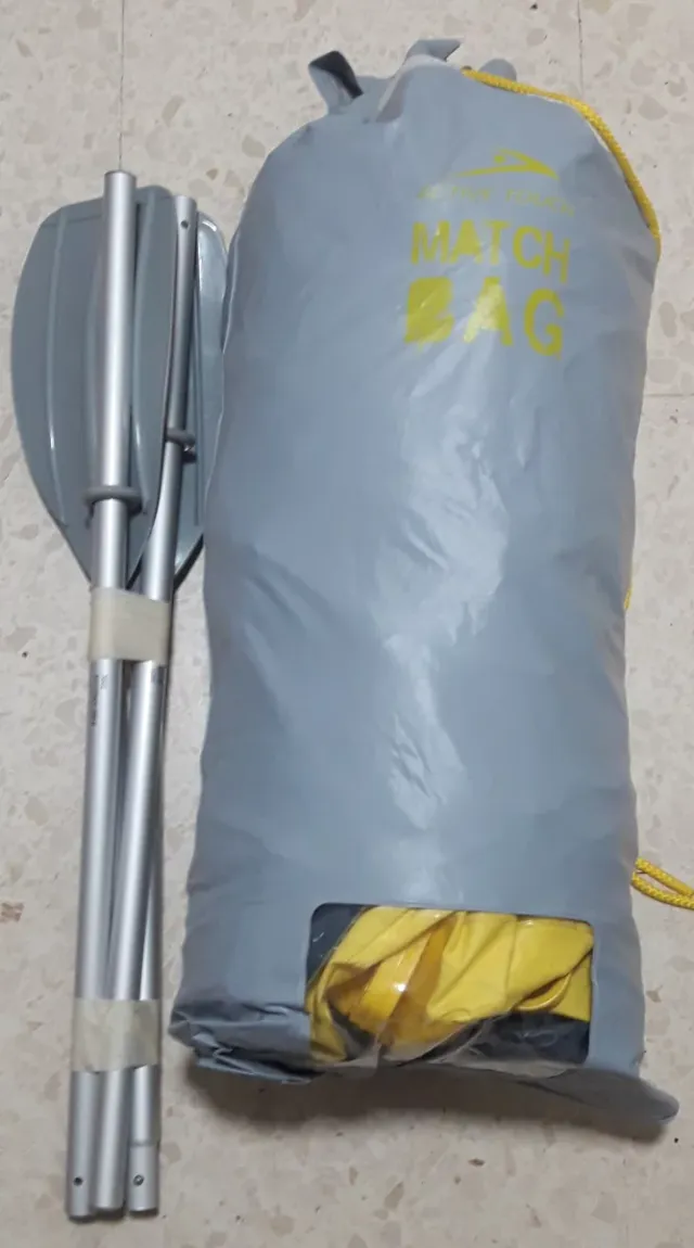 Detalles del productoBarco hinchable de color gris y amarillo, ideal para disfrutar del agua. Incluye remos y una bolsa de transporte.