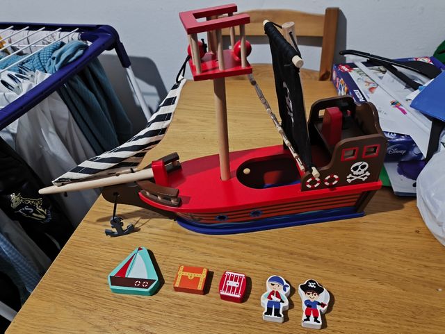 Detalles del productoBarco pirata de madera de la marca Drim, en buen estado. Incluye 2 figuras de piratas, un cofre del tesoro, un barril y un barco pequeño. Es un juguete ideal para fomentar la imaginación y la creatividad. - Hecho de madera. - Colores vivos y atractivos. - Perfecto para juegos de rol.