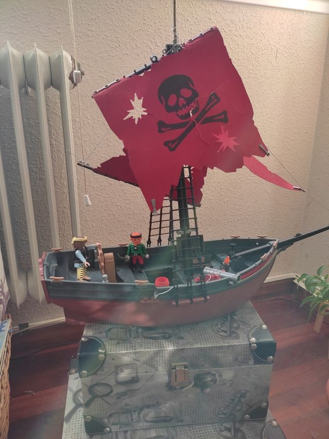 Barco pirata de Playmobil de los años 90. Con accesorios: un cañón, 2 Playmobil, un cofre