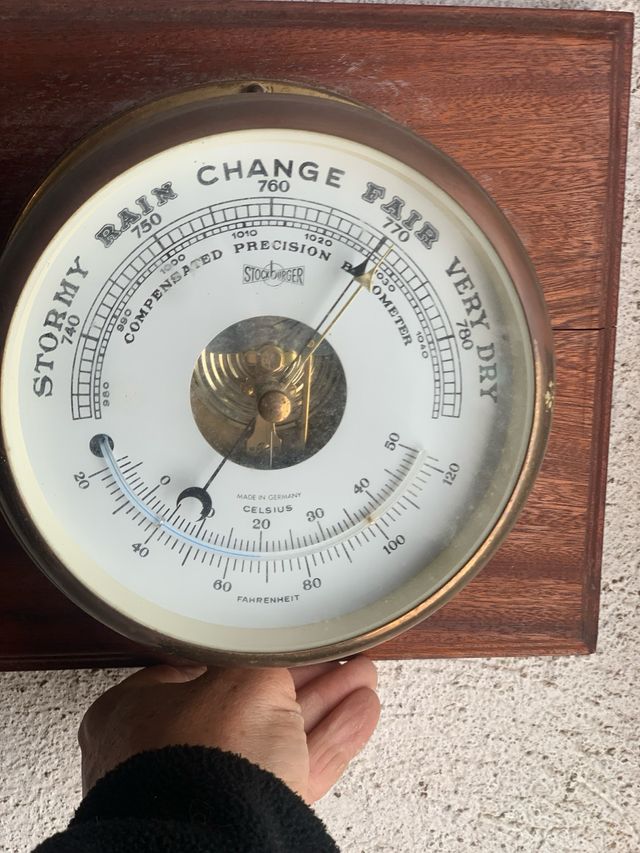 Barómetro de precisión Stöörger montado sobre base de madera.