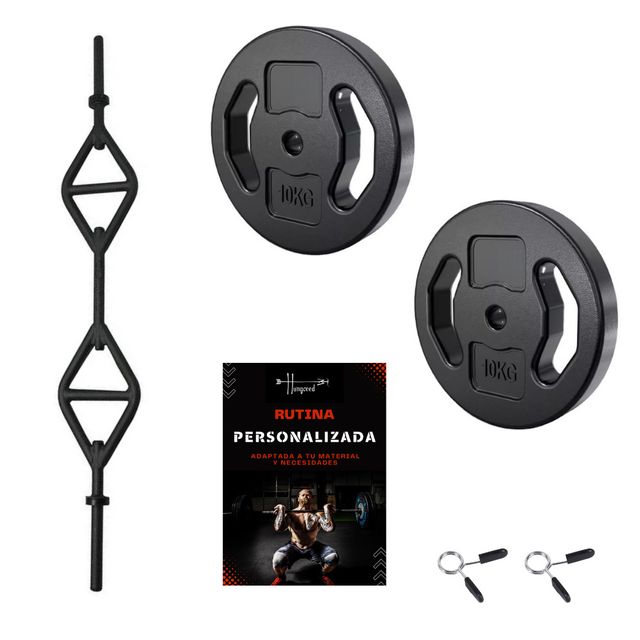 ✅ Juego compuesto por 1 Barra Multiagarre + 2 discos pesas 10kg ✅