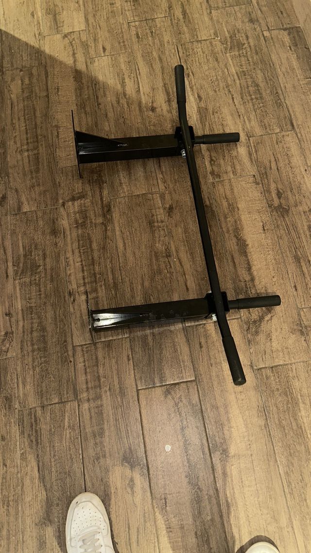 Barra de dominadas de color negro, diseñada para montaje en pared. - Construcción robusta de metal. - Mangos con agarre antideslizante.