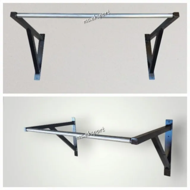 Detalles del productoBarra de dominadas resistente para montar en la pared. Fabricada en metal negro con barra de agarre zincada.