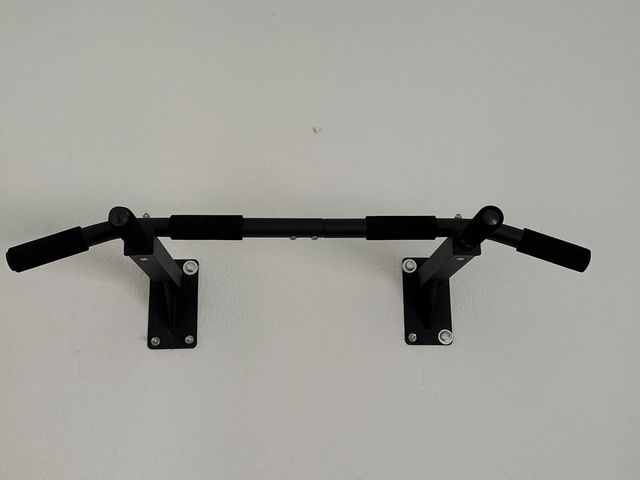 Detalles del productoBarra de dominadas para montar en la pared. Fabricada en metal negro con agarres acolchados para mayor comodidad.