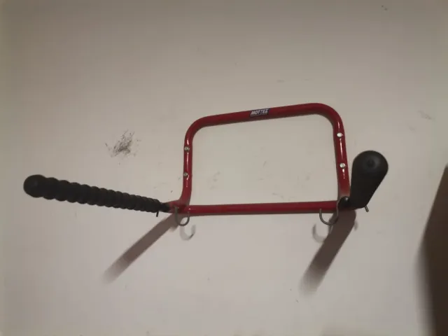 Detalles del productoBarra de ejercicio de color rojo, diseñada para ser montada en la pared. Cuenta con agarres de goma negra para mayor comodidad.