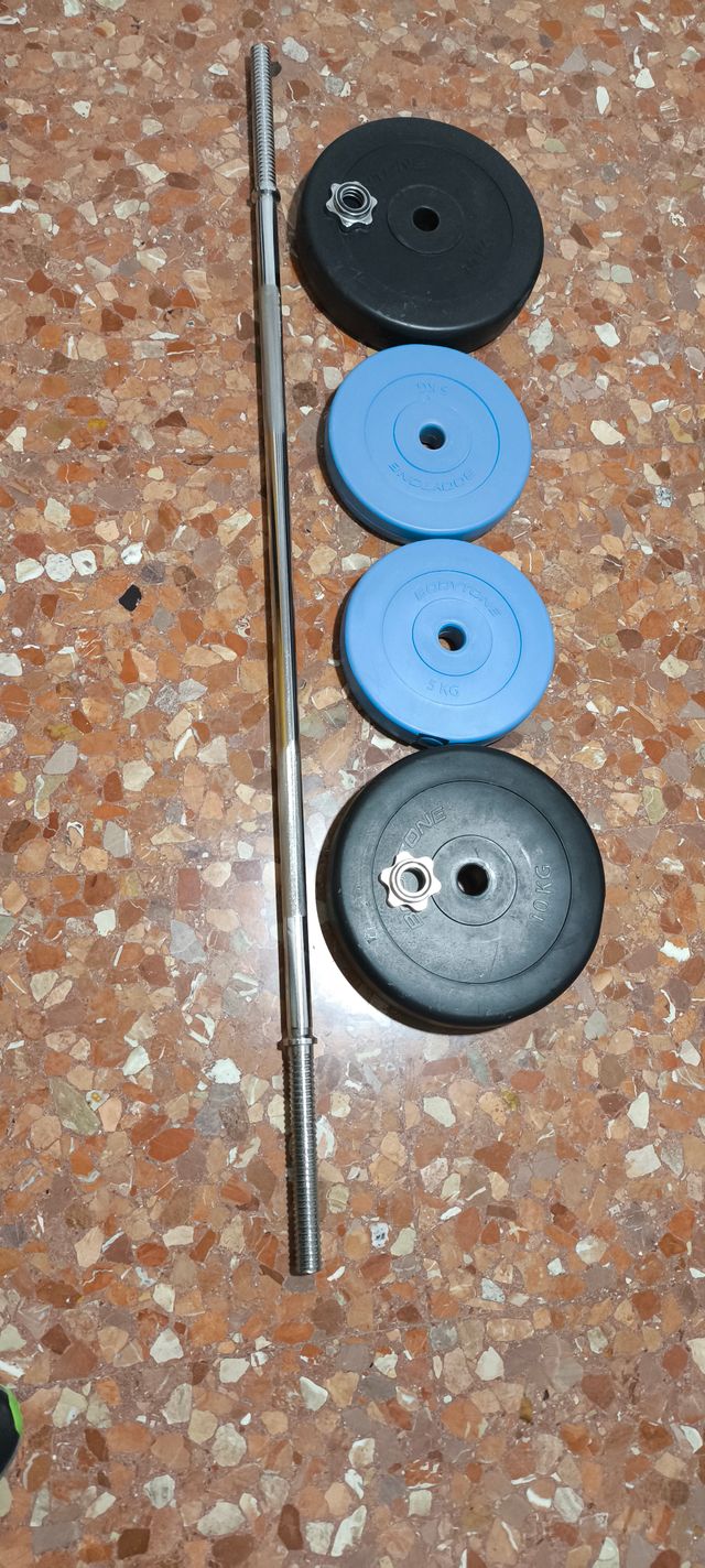 Detalles del productoBarra de pesas de 120 mm de largo y 28 mm de grosor, 2 discos de plástico de 10 kg y 2 discos de 5 kg.