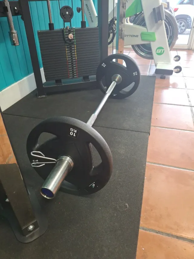 Detalles del productoSet de barra olímpica con dos discos de 10 kg cada uno. Total 20 kilos más el peso de la barra 8 kilos.