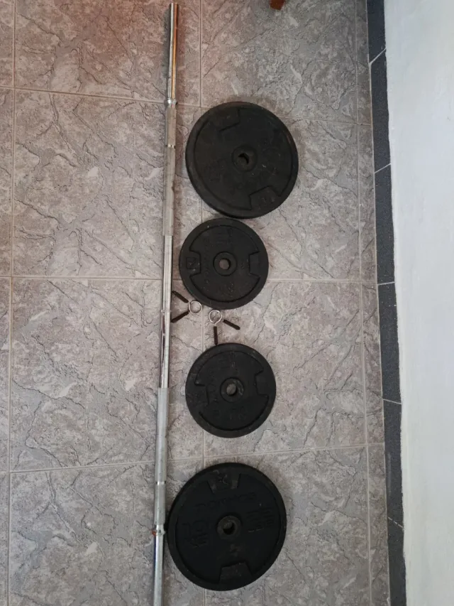 Set de barra y discos de pesas para entrenamiento. - Barra metálica. - Discos de pesas negros.