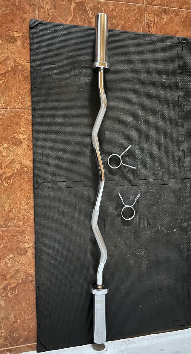 Barra Z olímpica en perfecto estado, sin usar. Ideal para entrenamientos de bíceps y tríceps. - Barra Z olímpica. - Incluye dos pinzas de seguridad.