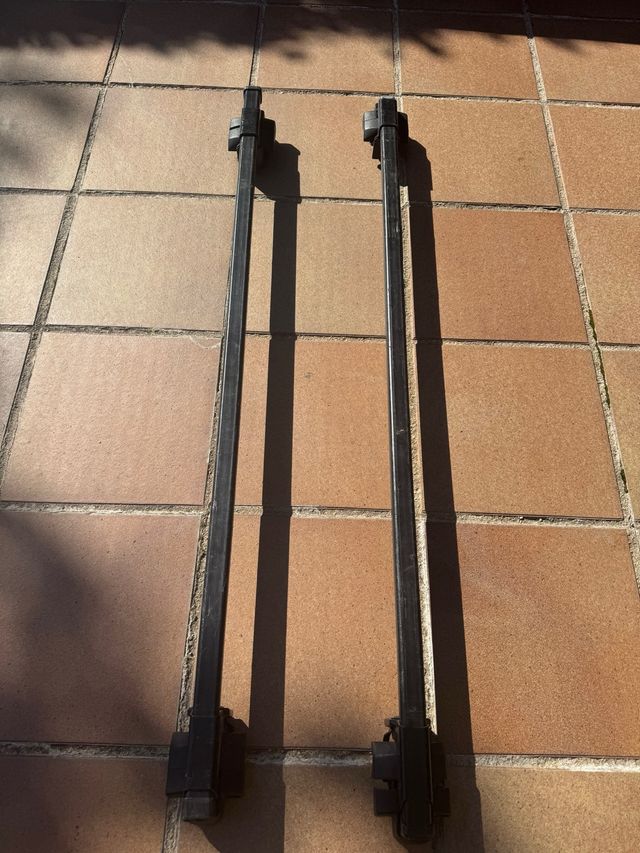 Juego de barras de techo Thule para coche. Son negras y de metal. - Incluye dos barras. - Mecanismo de fijación en los extremos.