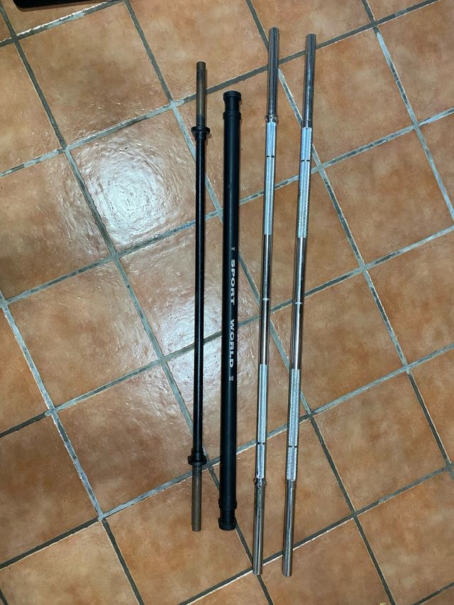 - Dos barras plateadas con agarre moleteado. Una de 9kg por 25€ y una de 6kg por 19€