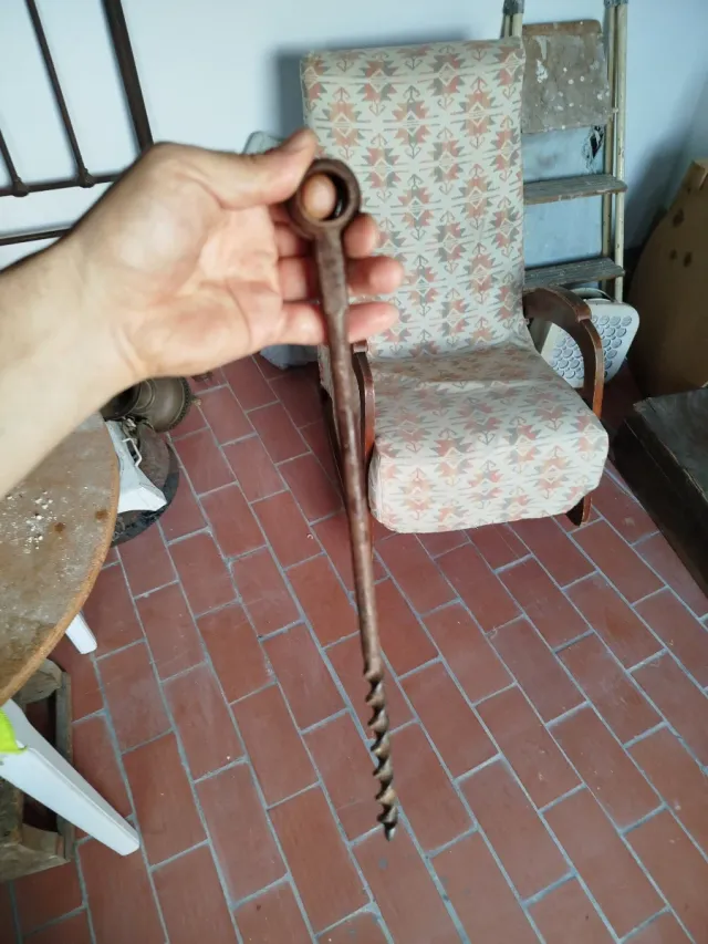 Herramienta manual antigua con un diseño rústico. - Mango con orificio para colgar. - Punta en espiral para perforar.