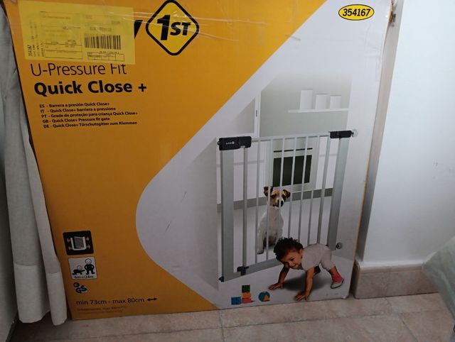 Detalles del productoBarrera safety first para escaleras y puertas. Ajustable y facil de poner y quitar. SIn abrir agujeros. Movible. Medidas del producto