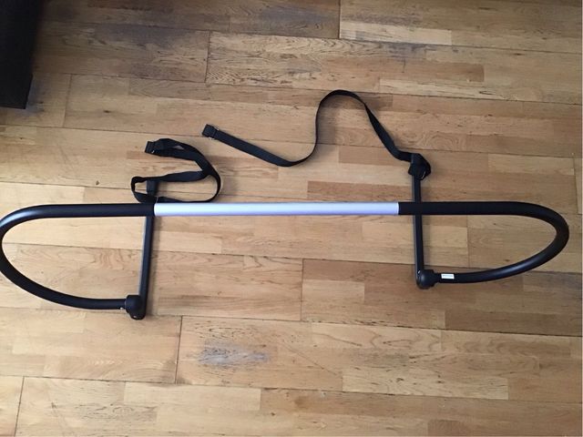 Estructura de barrera para cama de niños. Se encuentra en buen estado. - Material: Metal y tela. - Color: Negro y plateado. - Incluye correas de sujeción.