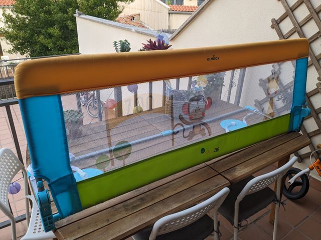 Detalles del productoBarrera anticaída de viaje, fácilmente desmontable, de la marca Olmitos. Con instrucciones de montaje. 150x60cm. Medidas del producto