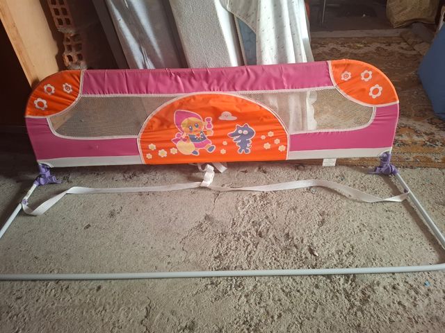 Barrera de seguridad para cama infantil, con un diseño divertido. - Estructura de metal y tela. - Dibujos de niña y zorro. - Color rosa y naranja.