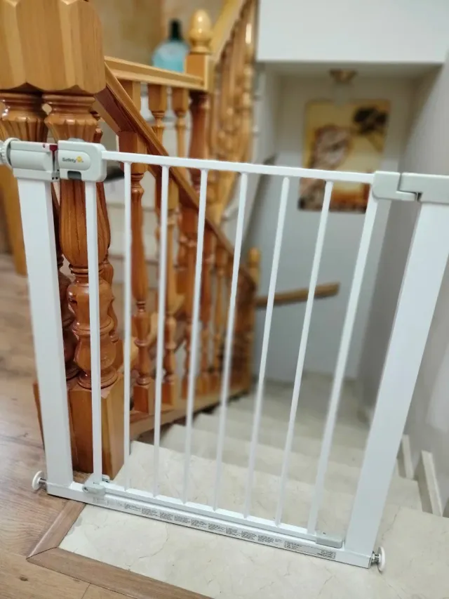Barrera de seguridad blanca para escaleras. Fácil de instalar y desmontar. - Material: Metal. - Color: Blanco. - Diseño de barras verticales.