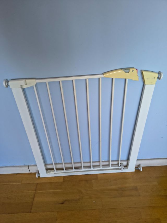 Detalles del productoBarrera de seguridad de color blanco y detalles en amarillo, ideal para proteger escaleras o puertas.