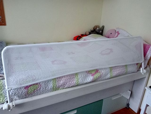 Bonita barrera protectora abatible de la marca Jané, de tela de rejilla color blanco (La entrego limpia) y en buenas condiciones, sólo tiene algún desgaste en el metal en la barra que va oculta por el colchón. Los dos seguros laterales funcionan perfectamente