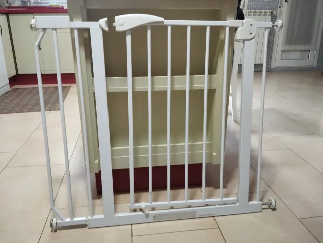 Barrera de seguridad para bebés y niños. Ideal para mantener a los más pequeños seguros en casa. - Estructura de metal blanco. - Diseño de barrotes verticales.