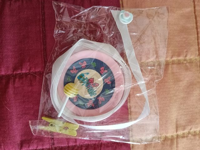 Set de accesorios para muñecas Barriguitas. Incluye un plato con diseño floral, un chupachups, un chupete y una pinza de ropa amarilla.