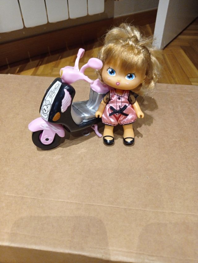 Muñeca con moto y casco de tela. Las pegatinas están un poco despegadas en alguna punta como se puede apreciar en la foto. Pero con un toque de pega solucionado.