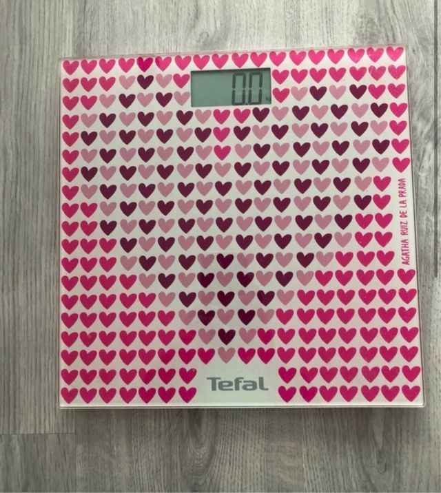 Báscula digital con un divertido diseño de corazones de Agatha Ruiz de la Prada. - Diseño de corazones en rosa y morado. - Marca: Tefal.