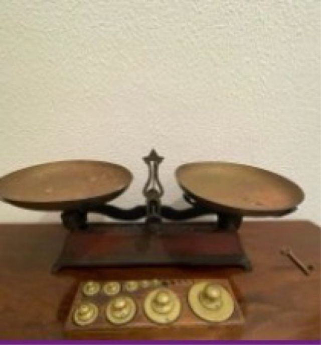 Báscula antigua de latón con su juego de pesas. - Diseño clásico de dos platillos. - Base de madera oscura. - Incluye juego completo de pesas de latón.
