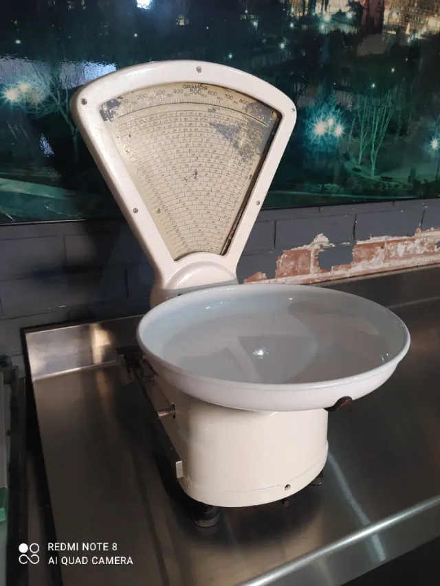 Báscula de vintage - Diseño clásico en color crema. - Plato de metal. - Escala de medición en gramos.