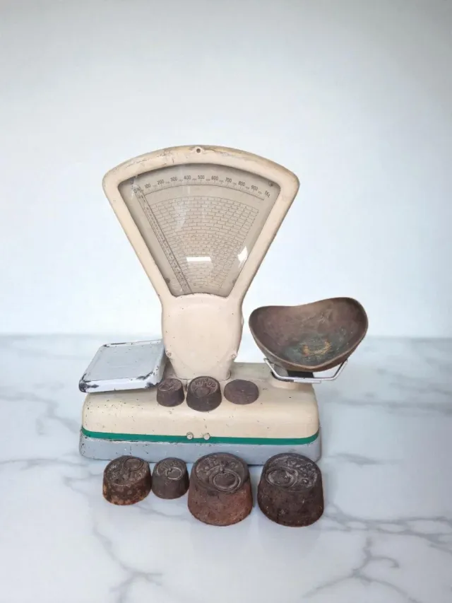 Báscula de cocina antigua de la marca Arisó. Un objeto decorativo con un diseño clásico. - Plato de pesaje. - Balanza con escala. - Incluye pesas.