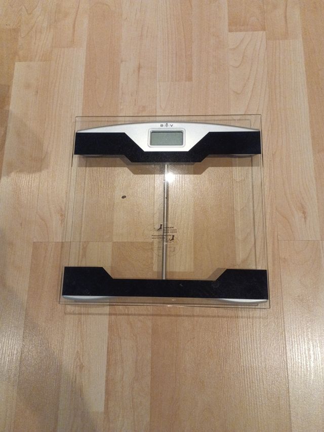 Báscula de baño digital en buen estado. - Superficie de cristal. - Diseño moderno y elegante. - Pantalla digital fácil de leer.
