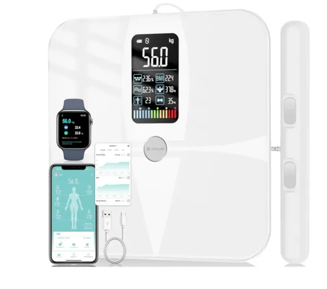 Lepulse Bascula Bioimpedancia 8 Electrodos, Digital Bascula Grasa Corporal y Muscular Recargable Con Pantalla Grande, Precision Bascula de Baño Grasa Corporal Balanza Inteligente con 20 Mediciónes.