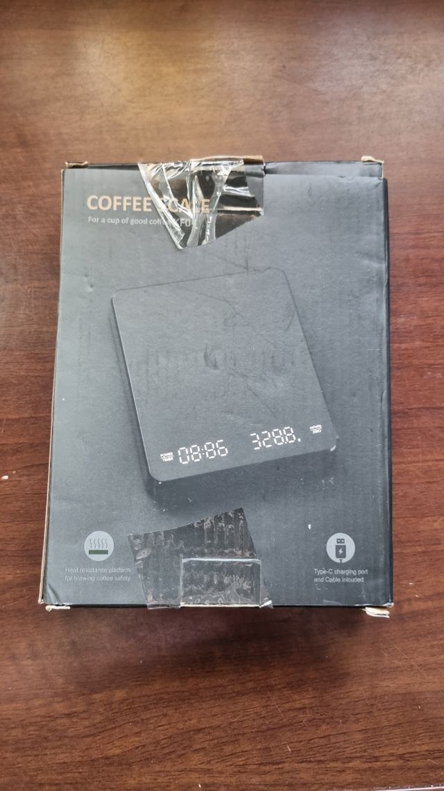 Detalles del productoBáscula digital para café, ideal para preparar tu café favorito con precisión. Es negra y tiene un diseño compacto.