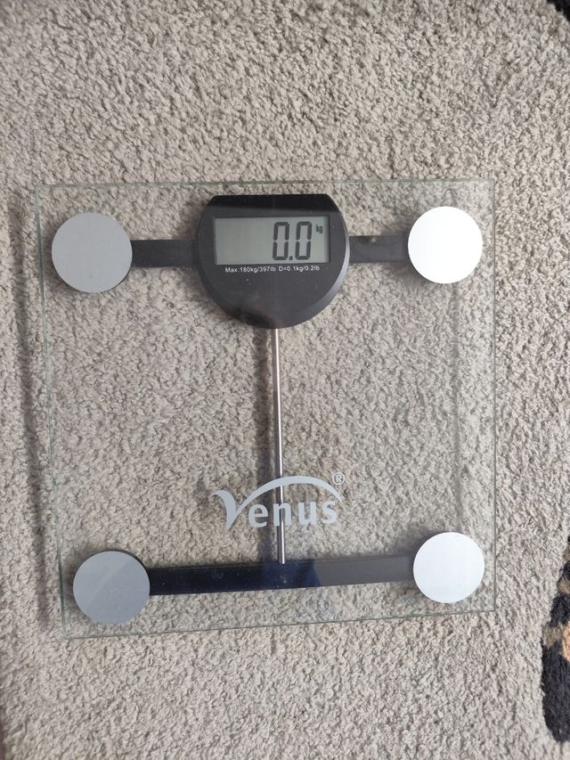 Báscula de baño con diseño moderno y superficie de cristal. - Pantalla digital clara. - Diseño elegante y minimalista. - Marca: Venus.