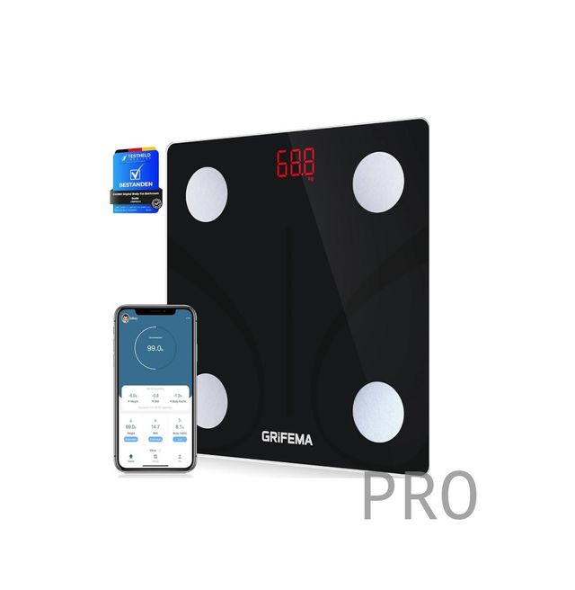 GRIFEMA, GA2001 Bascula de Baño Digital Grasa Corporal, Bluetooth Inteligente con Aplicación MovingLife, 13 funciones de monitoreo corporal, Máximo 150kg, Negro Medidas del producto